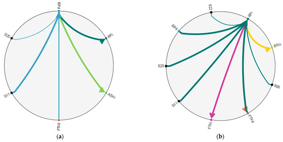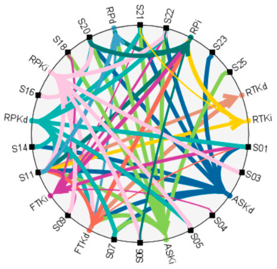 Causality diagrams for the previously forecasted target variables are presented for two levels: direct and indirect causal relationships. Figure 6 demonstrates the direct causal relationships affecting RPd, as shown in Figure 8. The most significant causal relationship affecting RPd is represented by S11, which is shown as the thickest line of causality, indicating a very strong influence. Following S11, the next significant causal factors are FTKd (revenue freight tonne kilometers), S20, S22, S05, S06, S10, S14, and another instance of S22, listed in descending order of significance.