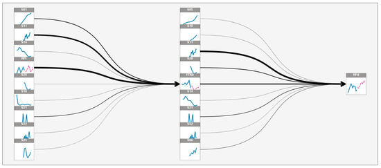 Figure 4 shows the complexity of simultaneous modeling of several time series using the temporal causal model. It shows the causal connections between the series in the system. Causal connections between time series are indicated by lines of different colors and thicknesses, with arrows indicating the direction of causality.