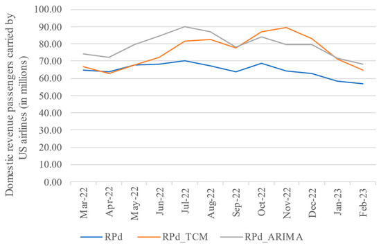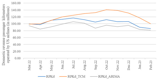 Figure 9 shows how, for the first quarter, the TCM-forecasted values (line RPd_TCM) correspond to the actual realized revenue passengers carried by US airlines in domestic traffic (RPd). After that period, the lines begin to separate, but the TCM forecast is still more suitable than the ARIMA forecast (line RPd_ARIMA).