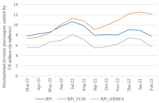 The results, i.e., the performance of the proposed temporal causal model used for forecasting demand in passenger air transport, were compared with the results of the implemented ARIMA model on the same dependent variables that were applied in the TCM, for the same period: from April 1990 to February 2022. The ARIMA model was developed specifically for time series forecasting and uses historical values of a time series to predict future values of that same series. ARIMA models describe the mechanical, i.e., statistical, properties of time series. Figure 9, Figure 10, Figure 11 and Figure 12 represent the revenue passengers and revenue passenger kilometers of US airlines (in domestic and international traffic) in the period from March 2022 to February 2023 [3]. Additionally, forecasts for the same period, generated using both the Temporal Causal Model and the ARIMA model, are presented for comparison in those figures.