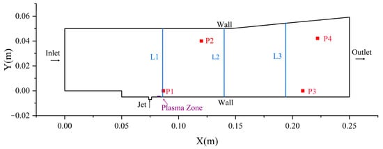 The inlet and jet conditions are given in Table 1. The free stream consists of 77% N2 and 23% O2 by mass fraction, and the fuel jet is pure H2. Pressure monitoring points for flow convergence are labeled P1 to P4. The convergence criterion is determined when the monitoring points establish stable oscillations over time and the root mean square of conserved variables falls below 10−3. To evaluate the impact of actuation in different regions, three monitoring lines were established at coordinates X = 86 mm, X = 140 mm, and X = 194 mm, respectively.
