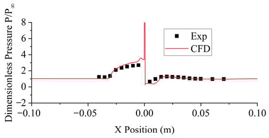 To ensure the accuracy of the numerical methods, validation was conducted using Aso’s experiment []. Aso conducted a slotted jet experiment on a flat plate in a Mach 3.75 crossflow. The nozzle had a streamwise length of 0.5 mm and a spanwise length of 100 mm, while the flat plate had a total width of 150 mm. The total pressure ratio between the crossflow and the jet is 0.51. Pressure measurement points were arranged 25 mm off the centerline. The numerical simulation employed a fine grid, with 840 × 450 nodes in the horizontal and vertical directions, respectively. The height of the first-layer grid was set to 8 × 10−4 mm, and the nozzle was positioned at the origin. A comparison of the dimensionless wall pressure between the CFD results and experimental data is shown in Figure 3. The predicted upstream separation point falls well within the range indicated by the experimental data, and the downstream data also exhibit good agreement. Some discrepancies are observed near the nozzle. The upstream pressure peak and its location could not be validated due to the limitations of measurement point placement, while the predicted downstream pressure rise point deviates backward by 3.2 mm.