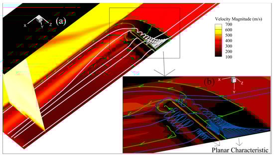 To validate this qualitative hypothesis, the same numerical method was used to simulate the three-dimensional flow. The computational domain was set to half of the experimental domain with symmetric boundary conditions applied at the center section. A relatively coarse grid was used, with a node distribution of 350 × 200 × 110 and approximately 7.5 million cells. The flow characteristics are shown in Figure 4, where the green arrows represent streamlines on the wall plane, and the white and blue streamline rods display the flow in the spatial domain. The line connecting the upstream separation points forms a curve. The flow near the symmetric section exhibits distinct two-dimensional characteristics. The velocity near the upstream slit edge increases, which is consistent with the above hypothesis. The three-dimensional flow exhibits significant spanwise stretching interactions between vortices, which, although weak at the symmetric section, cannot be captured by two-dimensional simulations. The influence of dimensionality is not the focus of this study; for more detailed discussions, please refer to reference [].