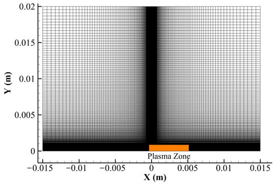 The perturbation caused by nanosecond-pulsed actuation in quiescent atmospheric air was computed by the method of Section 2.2, and the results were compared from reference []. Based on the peak voltage and pulse frequency from reference [], the calculated energy input in the plasma source region is 0.0652 mJ/cm, with a pulse duration of 20 ns. The far-field conditions were set as stationary air with a static pressure of 101.38 kPa and a temperature of 288.7 K. The discharge and flow response time scales range between femtoseconds (10−12 s) and microseconds (10−6 s) []. The time step of 5 × 10−9 seconds was chosen to accurately capture the thermal effects and reduce computational cost. The computational domain is illustrated in Figure 5, with far-field dimensions of 30 mm × 20 mm. The actuator is located at the origin, and the grid comprises 240 × 200 nodes. The source region grid was refined, with a minimum grid size of 1 × 10−5 m.