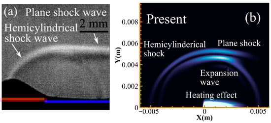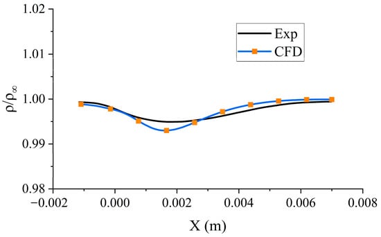 Figure 6 illustrates the flow structure 14 μs after the discharge, where (a) shows the experimental schlieren image [] and (b) shows the density gradient from the computation. It is evident that the plasma heating effect alters the near-wall density distribution, resulting in complex flow structures such as hemicylindrical and plane shock waves. The numerically simulated flow closely matches the schlieren results from the experiment. Figure 7 presents the dimensionless density distribution curve at Y = 1 mm, 0.3 ms after the discharge. The trend is consistent with the reference results, with a maximum error of approximately 0.24%.