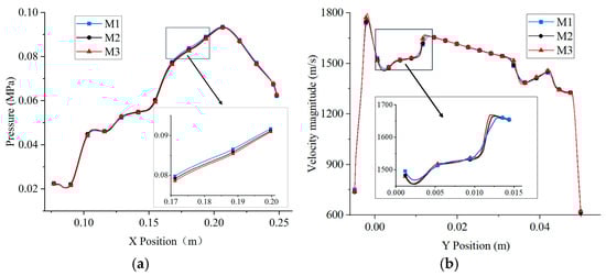 To determine the convergence of the grid in both the X and Y directions, the downstream wall pressure distribution of the jet and the velocity distribution along monitoring Line 2 were selected as evaluation parameters. Figure 8a,b present the comparison results of these two parameters, respectively. The curves for M2 and M3 nearly coincide, indicating that the computational results of these two grid sets have achieved a high degree of consistency.