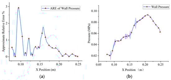 To further evaluate grid convergence, the analysis of grid uncertainty was conducted using the method described in reference []. A wall pressure of 200 and uniformly selected points within X = 80 mm to X = 249 mm were used as the calculation parameters. The related results are presented in the last three columns of Table 3, showing that the average relative errors (AREs) and grid convergence indicators (GCIs) for the medium grid (M2) and fine grid (M3) have both decreased. Figure 9a illustrates the distribution of the ARE along the X direction, with the maximum error confined within 3% and only 37 points exceeding 1%. Figure 9b depicts the numerical error band plot of wall pressure for grid M2 based on the extrapolated GCI, with an average value of 1.62%. The most prominent error band is observed near the separation region induced by the reflected shock. These analyses indicate that the medium grid M2 can balance computational efficiency with a certain level of computational accuracy, as detailed in Figure 10.
