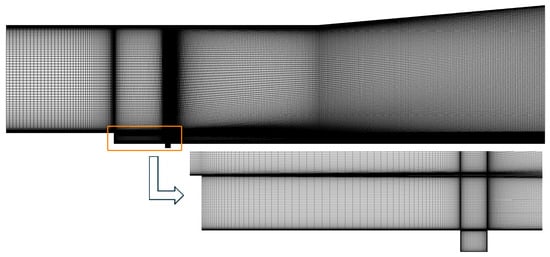 The equation is solved by the finite volume method. Convective flux was discretized in a second-order Roe scheme [], and viscous flux was calculated by a central difference scheme. The SST k-ω turbulence model is selected [], which has proved feasible for simulating jets in supersonic crossflow [,,]. Time integration is performed using a dual-time stepping method, with the physical time derivative discretized by a second-order implicit scheme.