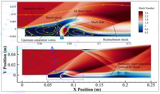 The steady flow was analyzed in Figure 11, where the numerical simulation accurately reproduces the typical flow structures resulting from the interference between the supersonic crossflow and the jet, including the Mach disk and barrel shock. The bow shock is degraded to oblique shock due to blockage by the backward-facing step. The upstream separation shock and the oblique shock jointly induce the separation of the upper wall boundary layer and generate corresponding reflected shocks. The intense interference between the jet and crossflow ignites hydrogen, while the upstream separation vortices effectively stabilize the flame. The computational results indicate a hydrogen consumption rate of 0.02519 kg/s and a total pressure recovery coefficient of 0.8052. Compared with reference [], the errors are 4.9% and 1.5%, respectively, mainly due to differences in mesh refinement details and the chain combustion reaction model.