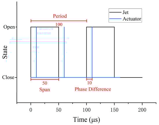 For the pulsed hydrogen jet, according to the conclusions of reference [], a duty cycle of = 0.5 and a jet frequency of = 10 kHz can minimize fuel consumption while ensuring certain combustion conditions. This study adopts these parameters as the jet conditions. During the jet-on phase, hydrogen was expelled in a rectangular pulse form, as illustrated in Figure 12. In the jet-off phase, the jet velocity at the nozzle boundary was zero. For comparison purposes, the waveform of the actuator is also depicted in the figure.
