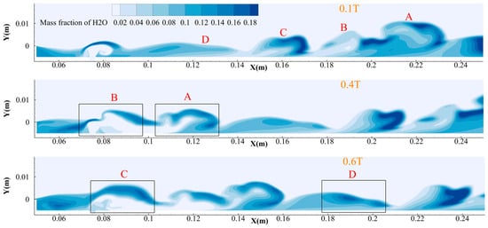 After approximately seven cycles, the flow developed stable oscillations, and data from the tenth complete cycle were selected for subsequent analysis. To clearly show the dynamic process of the jet, Figure 13 presents the H2O mass fraction distribution at a different time, where the white region represents areas of high H2 concentration. The pulse jet period is = 100 μs, with the jet opening at t = 0.0 and closing at t = 0.5. At t = 0.1, hydrogen reaches the actuator position and starts accumulating, while the residual hydrogen from the previous cycle forms three hydrogen clusters, spaced about 30 mm apart. At t = 0.4, the interaction between the jet and the crossflow generates the peak and trough structure, resulting in the formation of hydrogen clusters A and B. By t = 0.6, hydrogen cluster C forms as the jet closes, while the continuous hydrogen stream D fills the gap between the two jet pulses.
