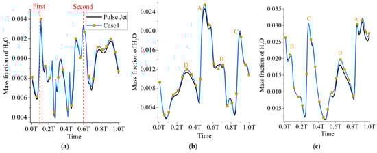 Temporal variation of the average H2O mass fraction along the monitoring lines: (a) X = 0.086 m, L1; (b) X = 0.14 m, L2; (c) X = 0.194 m, L3. A–D represent the peak values of the corresponding flow structures.