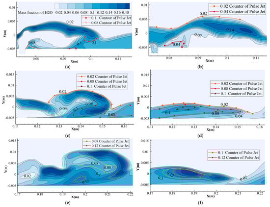 The second actuation impacts continuous flow D, and its flow behavior is shown in Figure 15b,d,f. Continuous flow D exhibited a lower penetration height and a more stable flow, resulting in poorer combustion conditions. The enhancement effect of the actuation was more pronounced. At t = 0.65, the near-wall thermal enhancement effect slightly increased the H2O mass fraction. As continuous flow D advanced downstream, the comparison of contour lines in Figure 15d,f indicated that combustion was primarily promoted by air diffusion in the middle region, which differs from the mechanism of cluster A.