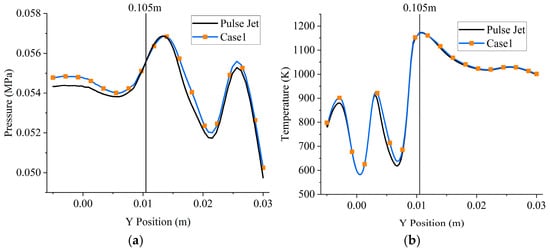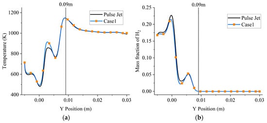 In Figure 17a, the temperature curve for Case 1 shows a significant increase near Y = 0.003, with an elevation of approximately 60 K, while the H2 mass fraction at the corresponding position in Figure 17b noticeably decreases. Since the cold flow field lacks combustion reactions, the reduction in H2 can be entirely attributed to air diffusion. This indicates that the air entering the H2 interior caused a sharp temperature spike at that location. Compression wave disturbances not only promote the mixing of H2–air but also introduce temperature transport effects. This temperature transfer further enhances the local reaction conditions, thereby significantly improving combustion efficiency.