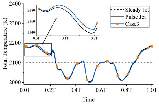 To assess the effect of an actuated pulsed jet on temperature oscillations, Figure 18 illustrates the temporal variation of the total outlet temperature. The peak and trough of the pulsed jet temperatures are 2185 K and 2023 K, respectively, corresponding to amplitudes of 4.1% and 3.6% of the mean total temperature of 2099 K. In Case 3, the amplitudes slightly increase to 4.2% and 4.8%. It is evident that the pulsed jet conditions used in this study do not induce significant temperature fluctuations, and actuation only slightly increases the amplitude.