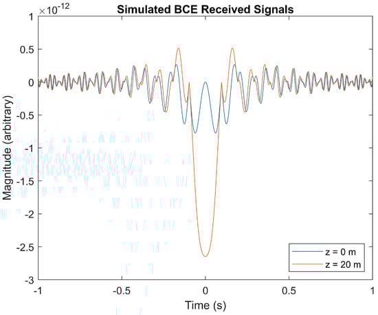 Key simulation parameters were defined in [], and adaptations were made to transmitter parameters to emulate the L1 C/A signal as defined in []. The ‘z’ variable shown in the legend represents the offset of the target’s center of body of mass and the bistatic baseline. The blue plot displays no offset, and the orange plot displays an offset of 20 m. In both cases, as the target approaches or departs from the baseline, there is a brief increase in signal power. At the crossing point, there is a prominent decrease in power. Therefore, the BCE is characterized by a ‘W’ or ‘U’ shaped waveform, which is easily seen on magnitude plots in low-noise environments or by correlation with an inverse Ricker wavelet [].