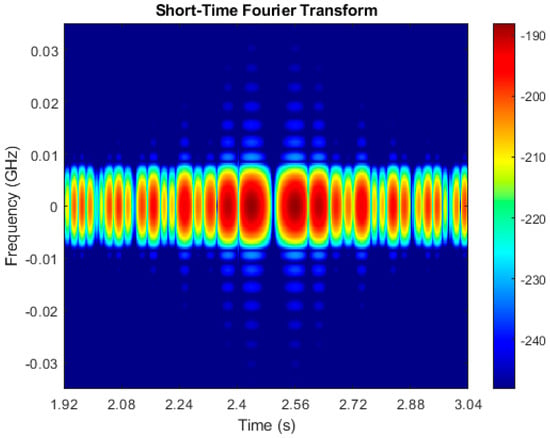 where is the target relative velocity, is the bistatic bisector angle (see Figure 1), and represents the angular difference between the target velocity vector and the bistatic bisector. As approaches , approaches . This means that, at the crossing point, there is no path difference between the direct and reflected signals, i.e., the target lies along the baseline between and in the bistatic plane. This effect can be highlighted by taking the Short-Time Fourier Transform (STFT) of the BCE signal model, shown in Figure 3.