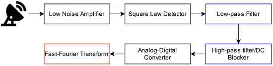 The received signal must first pass through a low-noise amplifier (LNA) to increase the signal power. This step is especially necessary for GPS signals that are incident on the earth’s surface at −134 dBm []. Next, the square law detector (SLD) squares any input voltage. The low-pass filter (LPF) will then remove the center frequency. The high-pass filter (HPF) or direct current (DC) blocker will remove any DC frequencies. After the analog-digital converter (ADC) passes the signal to the host PC system, the Fast-Fourier Transform (FFT) can be performed to observe any Doppler shifts. The black-outlined boxes represent analog components, the red-outlined box represents the digital component, and the blue-outlined boxes represent processes that can be implemented either through analog or digital components. Such a system may be realized by a software-defined radio (SDR) in series with an LNA and SLD. The Ettus X310 (National Instruments, Austin, TX, USA), for example, has an onboard field programmable gate array (FPGA) [] that may be tasked with signal acquisition to identify the space vehicle number(s) and satellite-induced Doppler shift(s). Afterward, the signals are downsampled and passed to the host PC for data binning and FFT processing.