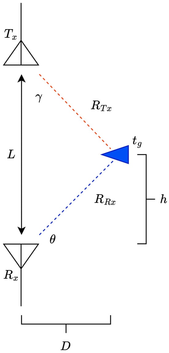 Radars primarily fall under two configurations: monostatic and bistatic. In the monostatic configuration, the transmitter and receiver are either the same antenna or are co-located. Bistatic radars result from the separation of the transmitter () and receiver () modules by some significant distance, as seen in Figure 1.