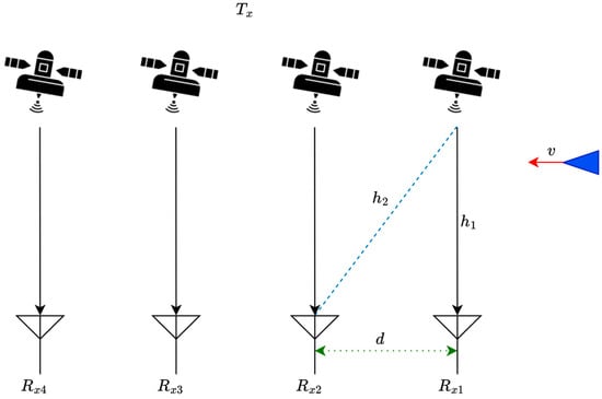 During the time instance while the Doppler at , Hz, the Doppler at , . Furthermore, as highlighted by the black circles in Figure 8b, the Doppler values at the remaining receivers are and . Therefore, a pattern of discrete Doppler shifts is recorded at subsequent receiver elements. This pattern can be summarized by Equation (20) when the reference receiver records zero Doppler shift. The shifts at the adjacent receivers are given by
