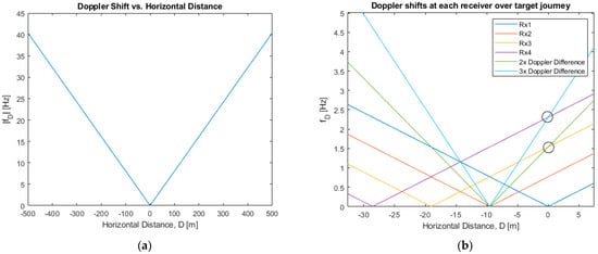 Figure 8a highlights a linear trend of Doppler increasing as the target is further away from the baseline. At the crossing point, there is no Doppler, thus indicating a successful target detection. The graphs show absolute Doppler values. According to Equation (5), is positive as the target approaches the baseline and negative as the target departs the baseline. Therefore, asymmetry as the Doppler shifts from positive to negative is expected.