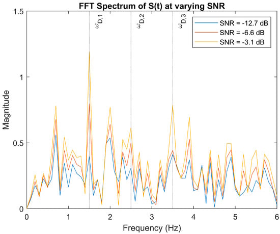 It was shown in Section 5.2.2 that the phase difference of the direct signal between the ULA elements is effectively zero. Therefore, if the signals are coherently summed, the amplitude of the direct signal is increased by the number of elements being summed. This, in turn, increases the amplitude of the filtered signal as there is dependence on both the reflected and direct signal amplitudes, as seen in Equation (19). Figure 9 displays the FFT performance in a severely noisy environment when receiver inputs from elements are added.