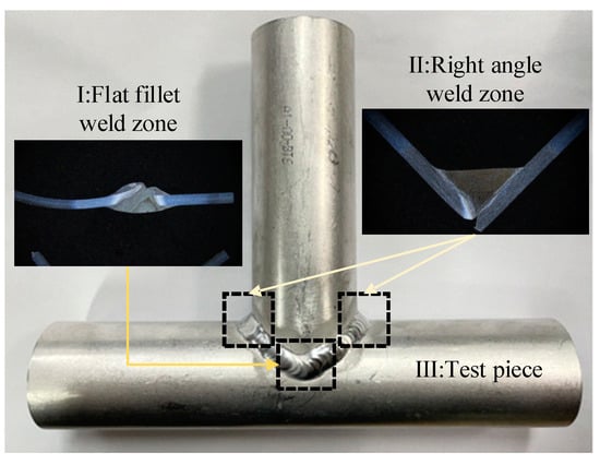 The different weld zones. I is the flat fillet weld zone, II is the right-angle weld zone, III is the test piece.