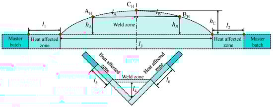 In the aluminum alloy welding process, the WZ has an inhomogeneous structure. Influenced by the welding rod material, the welding method, welding current of different welding layers and other parameters, including the mechanical properties of the final molded WZ, show significant differences in different zones. To carry out metallographic testing for aluminum alloy-welded joints, the joints are first finely cut and ground to ensure that the details of each zone can be clearly observed under the microscope. Subsequently, the specimens are viewed using a high-resolution metallographic microscope to determine the boundary parameters and specific metallographic organization types of each zone in the welded joint. The metallographic diagrams of the specific test pieces and welding zones are shown in Figure 1. Through this test, the dimensional parameters of each part of the WZ of the T-type coherent-welded test piece are obtained, and the specific dimensional labeling and values are shown in Figure 2 and Table 1. In order to measure the mechanical property parameters of the WZ and the HAZ, tensile tests are generally used to obtain the stress–strain curves of the specimens and to determine the mechanical property parameters of the materials based on the test data. However, due to the small size of each individual zone in the WZ studied in this paper, specimen handling is very difficult, and it is difficult to directly apply the traditional tensile test method to specimen measurements. Therefore, a microtensile test method is needed to measure the specimens in the WZ and HAZ. Through the analysis and processing of the microtensile test data, the parameters of the WZ and HAZ can be obtained, mainly for the measurement of the modulus of elasticity and Poisson’s ratio, as shown in Table 2.