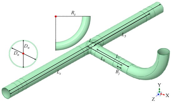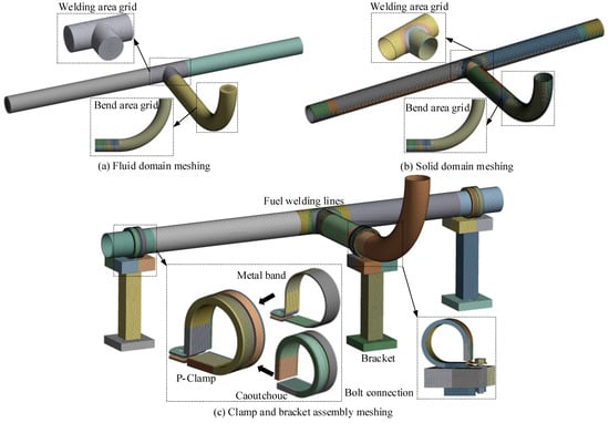 The present study concerns an aircraft fuel welding pipeline with an elbow, which is positioned at an angle of 90° with respect to the main pipe and the branch pipe. On the basis of the findings of the metallurgical testing, a more detailed model of the welded section of the pipeline was constructed. The fundamental geometric characteristics of the pipeline are defined by parameters such as the outer diameter of the main pipeline and the branch pipeline Dw, the length of the main pipeline Lu, and the vertical distance of the end face of the main pipeline from the axis of the branch pipeline Lz, among others. The specific structural parameters are presented in Table 3. In accordance with the aforementioned parameters, a comprehensive, high-resolution fuel welding pipeline refinement model is constructed, as illustrated in Figure 3. In practice, the aircraft fuel-welded line is typically constrained by clamps. However, previous studies [36,37] have not conducted a comprehensive analysis of the clamps, instead adopting a simplified approach to constraint processing. Accordingly, in order to accurately reflect the onboard environment of the pipeline, this paper will utilize the P-type clamp to restrain the pipeline and analyze the bracket in conjunction with it, thereby fully considering the impact of the bracket quality on the vibration characteristics of the pipeline system. The P-type clamp is connected to the bracket by bolts and nuts. Consequently, an assembly model including bolts and nuts, clamps, bracket, and fuel-welded piping is constructed, as illustrated in Figure 4. Furthermore, in order to conduct a comprehensive analysis of the fluid flow characteristics and the coupling effect between the fluid and the structure, a fluid domain model of the fuel-welded pipeline was constructed, upon which the subsequent flow field study was based.