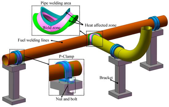 Assembly model of bolts, nuts, clamps, brackets, and fuel-welded lines.