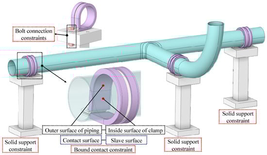 In the actual piping system, there is minimal relative motion between the clamp and the piping. Consequently, the linear contact mode is adopted, and the influence of the friction effect is excluded. The clamp and the piping are set as bound contact, and the specific boundary conditions are set as shown in Figure 5.