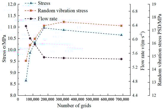 Since the local density of the network has a significant influence on the stress values at the points of sudden change in the cross-section, such as the throat of a branch and weld as a geometric notch [38], higher local mesh densities are used in this study in the above critical zones to improve the accuracy of the stress analysis. The pipeline fluid domain, solid domain, clamp bracket, etc., were meshed. Given that the mesh quality is a key factor affecting the accuracy and convergence of simulation calculations, the ANSYS Workbench 2022 software commonly employs four methods, namely, cell quality, aspect ratio, orthogonal quality, and deviation, to assess the mesh quality [39]. The mesh model quality of the fuel weld lines, clamps, and brackets were evaluated based on these methods, as illustrated in Table 4. The specific mesh models for the fuel weld line fluid domain, solid domain, and clamp and bracket assembly are illustrated in Figure 6. The mesh independence of the pipeline was verified using a multi-parameter and multi-node approach, with the inlet velocity of the fluid domain set to 9 m/s and the outlet pressure set to 0.5 MPa, respectively. The critical point A, located at the outer surface of the inlet end of the pipeline stub, was selected for comparison of the stresses exhibited at varying mesh numbers. The critical point B, situated at the weld end of the fluid domain, was selected for comparison of the flow velocity at varying grid numbers. The random vibration stress values at different grid numbers were compared at key point C, which is located at the outlet end of the inner surface of the pipeline. Figure 7 illustrates the variation in stress, flow velocity, and random vibration stress with the number of grids at specific key point locations. It was determined that the impact of parameter value fluctuations is inconsequential when the number of grids reaches 200,000. Accordingly, 213,932 meshes were employed in the present study for analysis purposes. The subsequent meshing of other models were verified using the same method.