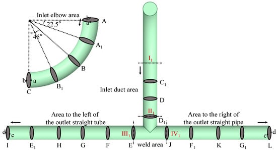 In the entire fluid domain, 19 monitoring surfaces were set up, specifically at the inlet bend region of the monitoring surfaces A, A1, B, B1, and C, which are in the elbow section at the 0°, 22.5°, 45°, 67.5°, and 90° position; inlet straight pipe region were used to set up the monitoring surfaces C1, D, and D1 and were located at a distance of 40, 75, and 115 mm from the I1; the outlet at the left side of the straight pipe of the region sets up the monitoring surfaces E, F, G, H, E1, and I, which are located at 0, 50, 100, 150, 200 and 250 mm from II1; monitoring surfaces J, F1, K, G1, and L, are located at 0, 50, 100, 150, and 200 mm from the position of III1 in the region to the right of the outlet straight pipe. In the subsequent fluid domain analysis, the focus will be on the above monitoring locations. At the same time, the state of the flow field at the monitoring locations A–L will be studied in detail, as shown in Figure 8.