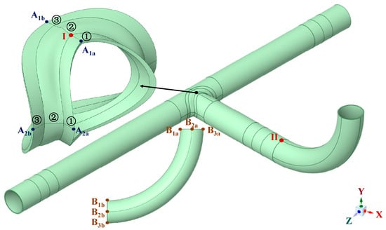 Three monitoring positions were selected to be explored in the welding and bending areas of the fuel weld line. For the welding region, A1aA1b on the upper side of the welding region, A2aA2b on the left side, and A3aA3b on the lower side of the welding region, which is symmetrical with the upper side, are selected, and for the bending region, B1aB1b on the inner side of the bending region, B2aB2b on the left side, and B3aB3b on the lower side are selected; meanwhile, to further investigate the effects of different fluid parameters on the pipeline’s random vibration characteristics, two random vibration stress response monitoring points are created at the critical areas of the pipeline, respectively, at the junction of the HAZ and the WZ at the weld. This was performed to set up monitoring point I, and at the junction of the inlet elbow and the straight pipe, it was performed to set up monitoring point II, see Figure 9 for details.
