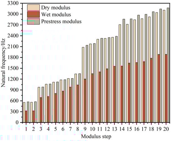 In the study of coupled dynamics of fuel-welded pipelines, it is essential to first analyze the inherent characteristics of the pipeline. This was achieved through the execution of dry, wet, and prestressed modal analyses, resulting in the acquisition of the first 20 orders of the inherent frequency values. These values are presented as comparative histograms, as illustrated in Figure 10. It was determined that the fuel-welded pipeline exhibited the highest natural frequency for each order under the prestressed modal analysis. This result can be attributed to the non-uniform pressure distribution generated by the fluid flow on the inner wall of the pipeline, which enhances the pipeline’s rigidity to a certain extent. In the wet mode analysis, the overall mass matrix of the system is increased due to the effect of the fluid mass, which in turn results in a decrease in the natural frequency. The natural frequency of the dry mode is situated between that of the wet mode and the prestressed mode, exhibiting a value comparable to the initial eight orders of the natural frequency observed in the prestressed mode. Nevertheless, as the order increases, the frequency difference between the two gradually increases.