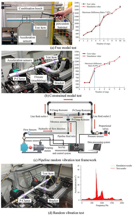 In order to evaluate the static dynamic behavior of the welded pipeline in the aircraft fuel system, a pipeline system test platform was constructed to carry out the free mode, constrained mode, and random vibration tests of the fuel-welded pipeline, respectively, as shown in Figure 11. In this test system, the pressure of the control system is precisely controlled by adjusting the opening size of the spool in the proportional valve. Sensors within the system are responsible for collecting and controlling flow and pressure data, as well as vibration response data at the pipeline monitoring points. The system consists of several key components such as the main pump, asynchronous motor, manual relief valve, accumulator, lines to be tested, proportional valve, filter, and cooler. The main pump is a 7-piston, constant pressure variable axial piston pump with a displacement of 92 L/min and an operating pressure of up to 35 MPa. At the same time, in order to enhance the safety of the test system, the pump port is equipped with a group of special safety relief valves in order to prevent the system from overpressure.
