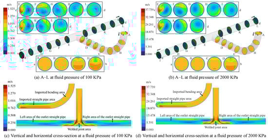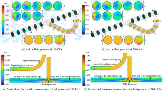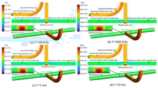 As illustrated in Figure 14a,b, in the bend region, the fluid is subjected to the effects of centrifugal force, resulting in a notable increase in pressure on the outer wall surface. With the rise in outlet pressure, the overall pressure rises, whereas pressure gradient along the radius direction remains consistent. In the region of the inlet straight pipe, the fluid pressure distribution is more uniform, which is a consequence of the fluid moving axially along the pipeline without generating additional centrifugal force. In the region of the welded joint situated at the bottom center, the pressure exhibits a gradual decrease from the central point towards the perimeter. In accordance with Bernoulli’s theorem, this result can be attributed to the abrupt alteration in the line’s configuration at the welded joint, which gives rise to a reduction in flow rate, an increase in pressure at the center region, a concomitant rise in flow rate, and a decline in pressure around the perimeter. In the region of the outlet straight pipe, the pressure distribution tends to be uniform, which indicates that the fluid passes through the welded joint to readjust the pressure, thereby achieving a more stable flow.