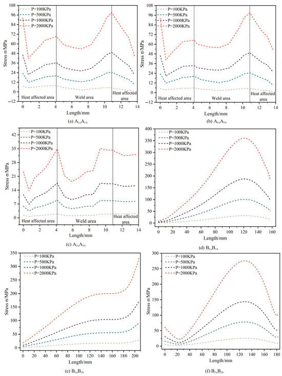 In order to gain a deeper understanding of the relationship between pressure change and length at different points along the bend region, as well as the influence of varying fluid pressures, stress plots were constructed for the inner B1aB1b, left B2aB2b, and outer B3aB3b regions of the bend. These plots illustrate the stress change with length at each of these points, and they were created at different pressures. As illustrated in Figure 16d–f, an increase in fluid pressure is accompanied by a notable rise in stress levels at all positions within the weld region. The maximum stresses in both the interior and the left side of the bend region are concentrated within a range of 110–130 mm. Concurrently, the stresses in the inner and left regions of the bend exhibit an initial increase, followed by a subsequent decrease, while the stresses in the outer region of the bend demonstrate a persistent increase.