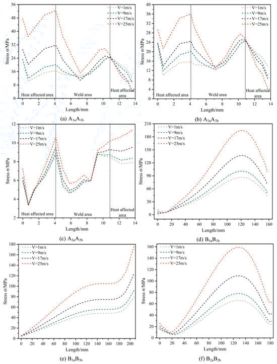In order to conduct a comprehensive examination of the stress trend with length and varying fluid pressures at distinct points along the welded pipeline, stress plots of stress change with length at A1aA1b on the upper side of the welded area, A2aA2b on the left side, and A3aA3b on the lower side under different pressures were constructed. As illustrated in Figure 16a–c, it is evident that the stress levels at disparate locations within the weld region exhibit a pronounced increase with rising fluid pressure. With regard to the upper, left, and lower sides of the weld region, the maximum stresses are observed at the junction between the WZ and the HAZ. In fuel-welded pipelines, the regions exhibiting high variability in stress levels represent potentially hazardous areas of the pipeline. In conclusion, the design of the weld region of the pipeline must consider the continuity of material properties, which can be prevented through the use of transition materials or appropriate heat treatment to avoid significant changes in material properties.