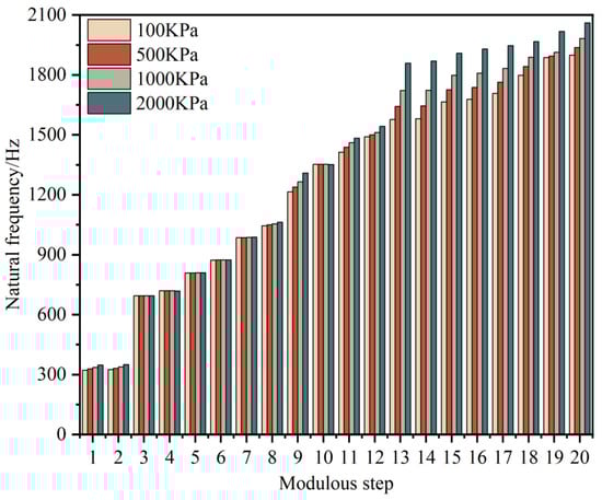 Histogram of the first 20 orders of natural frequency comparison of pipelines under different fluid pressures.