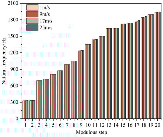 This section examines the impact of fluid pressure and fluid velocity on the natural frequency of the pipeline. To this end, the inlet velocity of the fluid domain was set at 9 m/s, while the outlet pressures were set at 100, 500, 1000, and 2000 KPa. This allowed for an analysis of the first 20 orders of natural frequency of the fuel-welded pipeline under different pressures. Furthermore, the outlet pressure of the fluid domain was set to 500 KPa, while the inlet velocities were 1, 9, 17, and 25 m/s. This allowed for an analysis of the first 20 orders of natural frequency of the fuel-welded pipeline at four flow rates.