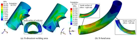 Since in practice the aircraft is mainly subjected to vibrations along the axial direction of the pipeline stubs, the study of the random vibration characteristics of the pipeline is carried out in the X-direction. The inlet velocity is 9 m/s, and the outlet pressure is 500 KPa. This is to investigate the random vibration characteristics of the pipeline under X-direction excitation. The three Sigma Mises stress characteristics of the specific welded and bend regions are shown in Figure 20a,b, respectively. It was determined that the maximum dynamic stress in the welded region of the pipeline under X-direction excitation is concentrated at the junction of the WZ and the HAZ, and its stress distribution is not uniform. This is attributable to the disparities in the microstructure of disparate regions within the welded joint and the discontinuities among the material properties. Concurrently, the bend region is subjected to unequal loading, which is susceptible to localized stress concentration, and its maximum dynamic stress manifests on the inner side of the bend. This result can be attributed to the geometrical irregularities introduced by the bending of the pipeline and the resulting fluid flow dynamics.