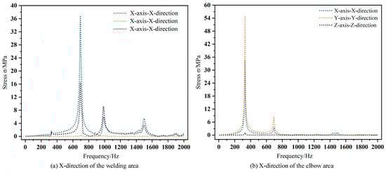 The results of the dynamic response analysis of the welded region of the pipeline indicate that the node with the largest stress response under X-axial excitation represents a critical point of concern. To gain further insights, the stress–frequency response curves of this critical point in the X-direction under X-axial random load excitation were obtained. As illustrated in Figure 21a, the welded region exhibits four distinct resonance response peaks under X-direction excitation. These peaks occur at the first-, third-, seventh-, and twelfth-order intrinsic frequencies, respectively. The maximum stress response is observed in the third-order mode in the X direction.