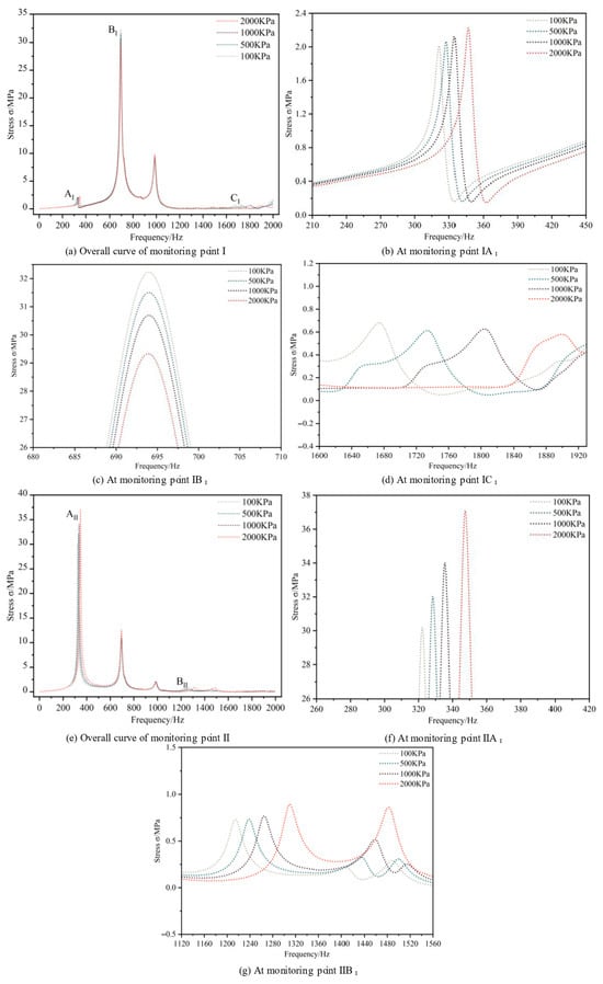 The monitoring points I and II were selected as the research objects. According to the aforementioned set up conditions, the stress–frequency response curves of random vibrations in the X-direction under X-axial excitation were analyzed and obtained for each monitoring point under different fluid pressures. These results are presented in Figure 22. As illustrated in Figure 22a–d, the presence of four resonance peaks at monitoring point I within 0–2000 Hz range is evident upon the increase in fluid pressure. These peaks exhibit a tendency to shift towards the right. In the initial and third resonance regions, the stress response amplitude typically increases with rising fluid pressure. This suggests that the resonance response of the pipeline at these frequency points is amplified under an elevated pressure, potentially due to its geometry and material properties [43]. In the second and fourth resonance regions, the overall decrease in stress response amplitude with an increase in fluid pressure is attributed to the fact that the overall stiffness of the pipeline increases with an increase in fluid pressure. Consequently, the pipeline produces less deformation when subjected to the same external force. Consequently, an increase in fluid pressure results in a reduction in the stress response of the pipeline when subjected to an identical vibration load. A similar trend is observed in the non-resonant region as a whole. The peak stress response is observed to be the greatest at the second resonance region, which indicates that the pipeline is more susceptible to fatigue damage at this frequency point.
