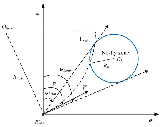 where is the instantaneous turning radius, is the radius of the no-fly zone, and denotes the center distance between the instantaneous turning circle and the no-fly zone. The instantaneous turning radius is calculated by the following Equation (11):