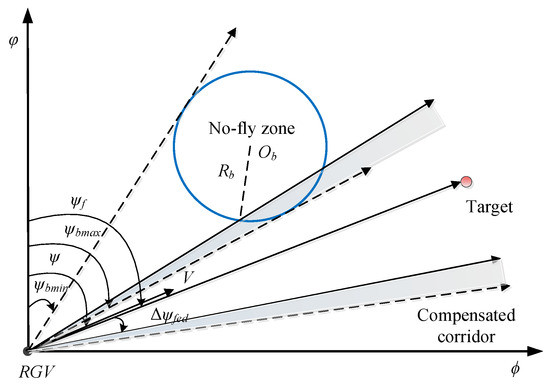 When the vehicle is conventionally guided, the heading angle corridor is employed to ascertain the sign of the vehicle’s bank angle at the present moment, thereby establishing a set of lateral parameter prediction models. In contrast to the conventional heading angle corridor, the no-fly zone may encroach upon the width of the corridor, resulting in repeated deflections of the bank angle sign. To circumvent this phenomenon, some compensation must be incorporated when constructing the corridor [33]. The schematic diagram of the heading angle corridor with compensation is shown in Figure 2.