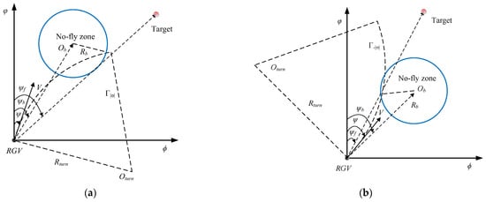 In the event that the vehicle is undertaking a guidance mission with the objective of avoiding the no-fly zone, there are two scenarios in which the current turning capability is insufficient to achieve it. In the first scenario, when both and are situated on either side of , there is an overlap between the vehicle’s instantaneous turning circle and the no-fly zone. This necessitates a maneuver to circumvent the no-fly zone in order to achieve evasion. In the second scenario, when and are on one side of , the instantaneous turning circle and the no-fly zone at intersect. This results in a small portion of the no-fly zone blocking the vehicle’s guidance trajectory. The schematic diagrams of the two cases are shown in Figure 3.
