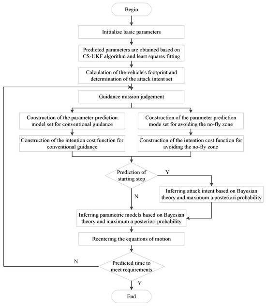In terms of vehicle maneuver mode recognition, the construction of pre-built corresponding prediction models based on different maneuver modes, and then the matching of these models through recognition techniques, have been demonstrated to be effective methodologies [19,20]. Chen et al. [21] employed historical tracking data to ascertain the parameters of the autoregressive integrated moving average (ARIMA) model, which was then combined with the unscented Kalman filter (UKF) algorithm to achieve the prediction of the vehicle trajectory. Wei et al. [22] utilized a double the sinusoidal summation function to align the reentry vehicle trajectory with the periodic jump characteristics. Cheng et al. [23] generated a set of maneuver modes based on the definition of maneuver modes to train the SVM, thereby achieving mode recognition and the prediction of vehicle maneuver trajectories. Sun et al. [24] employed linear attenuation terms and amplitude attenuation sinusoidal terms to derive analytical expressions for variables, such as height and speed, for a longitudinal jump-gliding trajectory of the vehicle under simplified conditions. They then implemented the calculation of the trajectory prediction pipeline with the assistance of an LSTM network. In terms of vehicle intention inference, since the reentry guidance always possesses a certain purpose, the trajectory prediction accuracy can be further improved by introducing the attack intention to correct the prediction result of the maneuver mode recognition method [25,26]. Zhang et al. [27] derived a recursive formula for the maneuver mode and motion state by constructing an intention cost function to achieve trajectory prediction under the uncertainty of vehicle maneuver. In order to address the issue of abrupt changes in maneuvering modes, Hu et al. [28] proposed a solution based on reference [27], transforming the trajectory prediction problem into the probability of the target passing through the reachable area by utilizing the intention cost function and the Bayesian principle. The algorithm did not rely on the dynamic process of the vehicle and demonstrated high short-term prediction accuracy; however, it was time-consuming and, therefore, not conducive to online prediction. In a subsequent study, Li et al. [29] enhanced the intention cost function proposed in reference [28] and developed a set of longitudinal and lateral time-varying prediction models, thereby enabling the multi-model and multi-intention fusion trajectory prediction of the RGV. However, the cost coefficient needed to be set manually, and the algorithm was not universal. Xu et al. [30] established a relationship between the initial state of the vehicle, the control variables and the flight area through a deep neural network, which improved the computational efficiency of attack intention inference and trajectory prediction. However, the algorithm did not consider the effect of the existence of a no-fly zone on the trajectory of the vehicle.