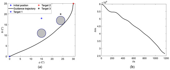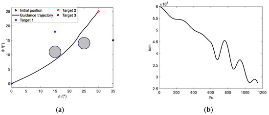 In calculating the avoidance cost coefficient, as outlined in Section 3.2.2, it is essential to consider the relationship between , , and . In the set of bank angle amplitudes for which the vehicle can avoid the no-fly zone, the least energy is lost when the trajectory is at a tangent to the no-fly zone. When Equation (30) or Equation (31) are satisfied, the avoidance cost coefficient requires the use of tangent bank angle.