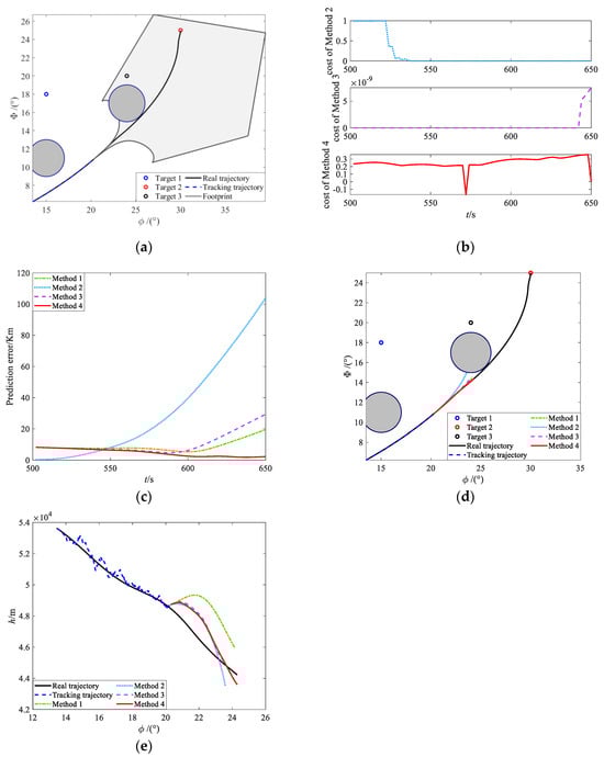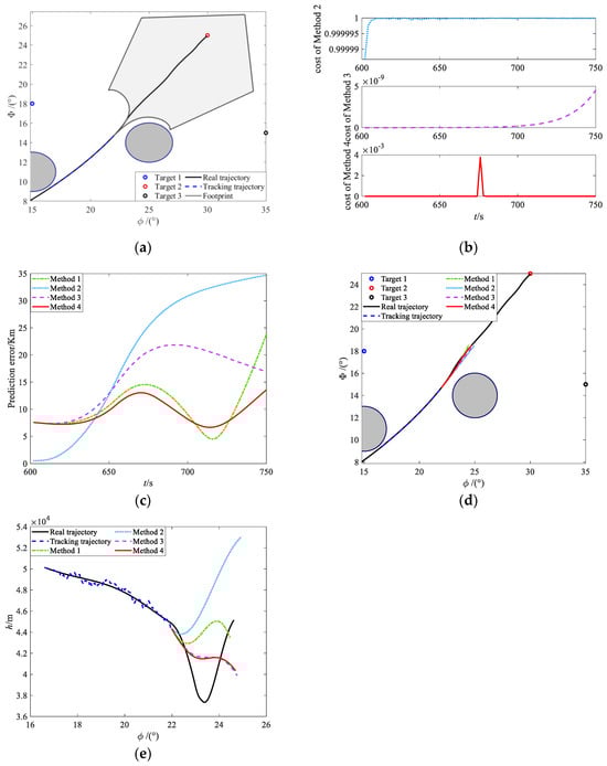 In the case of the mission, the design of the intention cost function primarily considers the angle cost and energy cost. For the conventional guidance of RGVs, the gliding process of the vehicle has two characteristics: (1) the heading angle should point towards the attack intention or within a small range near it; (2) under the influence of the parameter model, the vehicle’s own energy should reach a suitable planned speed, generally around 5 Ma, when it reaches the actual attack intention. Therefore, when constructing the cost function, intentions or models that satisfy these two characteristics should be assigned a smaller cost, while those that do not should be assigned a larger cost. The specific form is as follows: